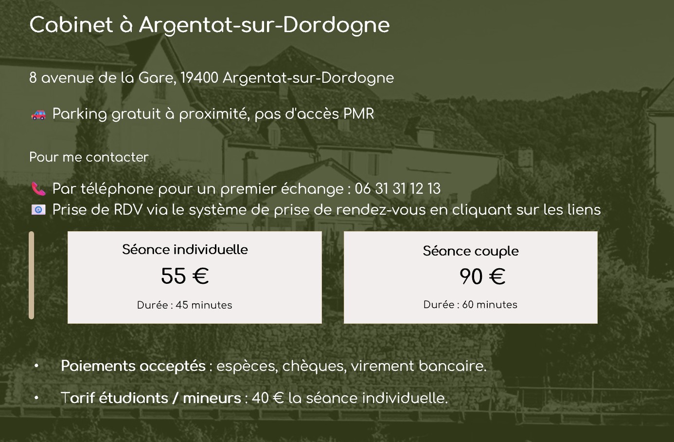 8 avenue de la gare à Argentat-sur-Dordogne - Un espace chaleureux et confidentiel pour vos séances en présentiel